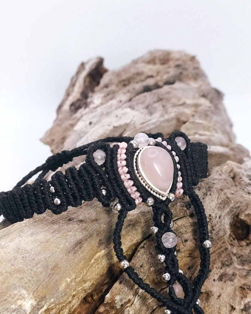 En el centro, un Cuarzo Rosa, piedra del amor y la serenidad, irradia su suave tonalidad rosada, envolviendo la pieza en una energía cálida y reconfortante. Pequeñas cuentas de acero inoxidable añaden un brillo sutil.