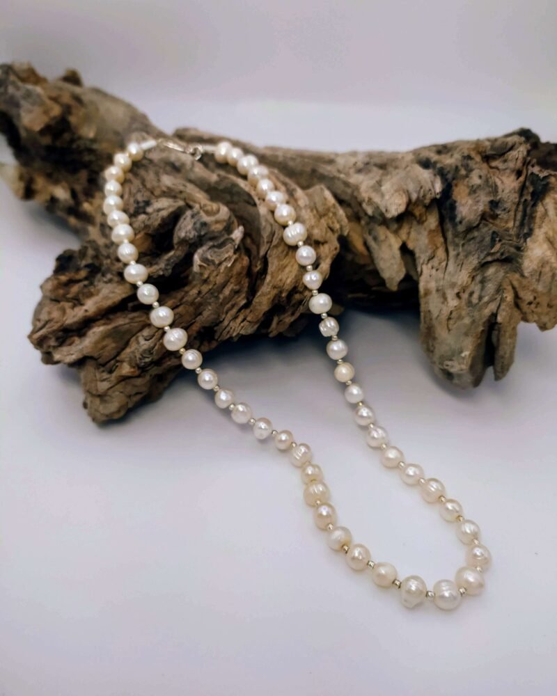 Esta joya de Perlas está hecha con hilo de macramé, Perlas de 5 mm de diámetro y cuentas de plata de ley.