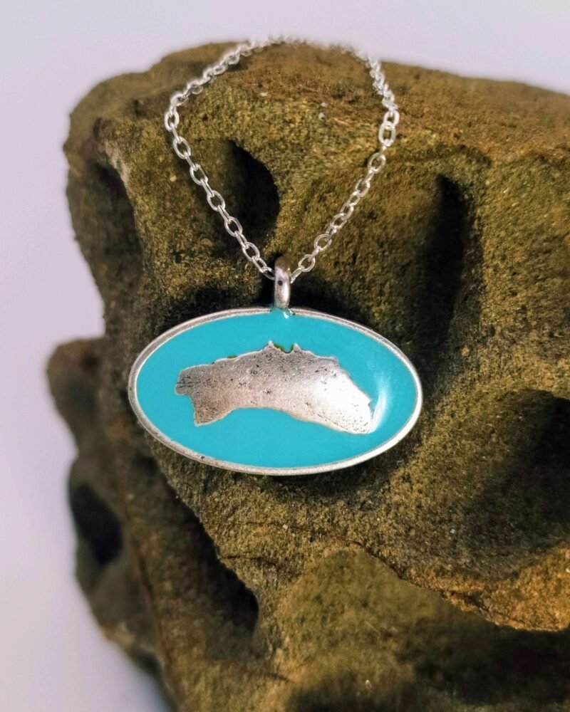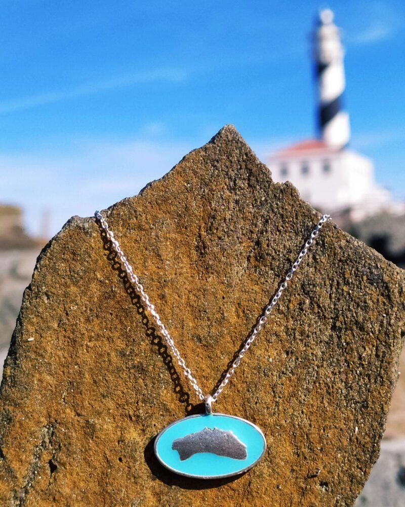 Este colgante representa la isla de Menorca, el esmaltado turquesa evoca el color del mar que envuelve la isla.