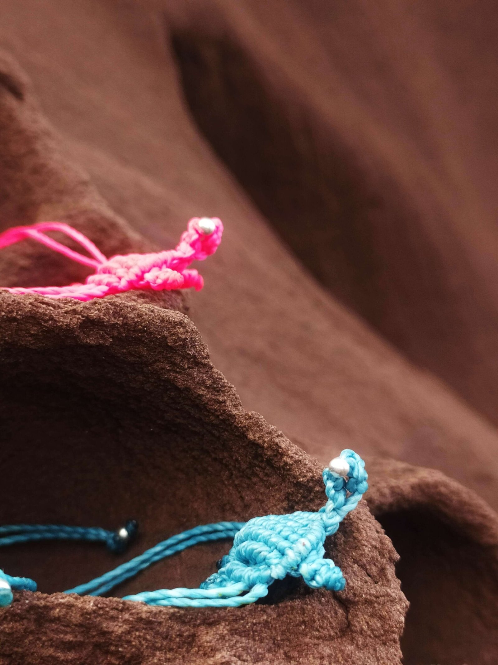 Dulce y llena de encanto, la pulsera Tortuguita es un detalle especial para los más pequeños. Tejida a mano en macramé con hilo de 1mm, su diseño delicado cobra vida con sus brillantes ojitos en plata de ley, que le aportan un toque de magia y ternura.
